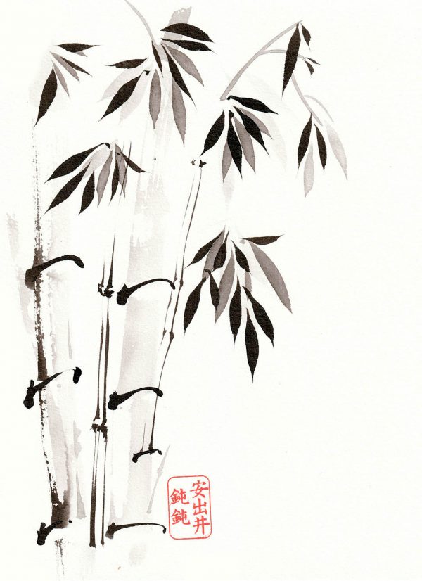 Los trazos del Sumi-e, antiquísima técnica de pintura al agua llevada a cabo con tinta china en barra molida sobre un tintero de piedra hasta llegar al negro y los pinceles clásicos japoneses, en busca de la belleza y la sencillez.