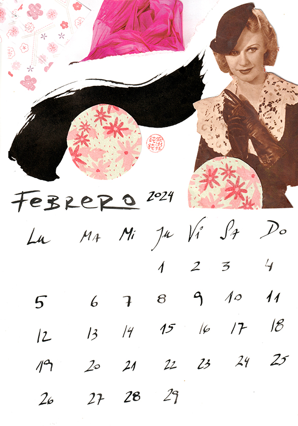 Creado a partir de la técnica Sumi-e, pintura japonesa, y una fusión con el collage, con detalles en papel de origami y retazos de telas vintage, este calendario esta hecho con mucha dedicación y amor, una fusión entre oriente y occidente, desde una mirada contemporánea.