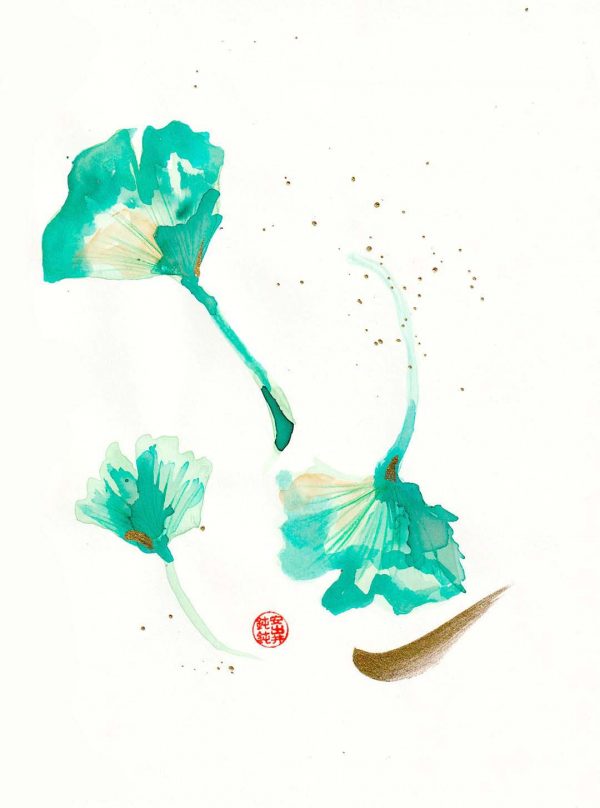 Los trazos del Sumi-e, antiquísima técnica de pintura al agua llevada a cabo con tinta china en barra molida sobre un tintero de piedra hasta llegar al negro y los pinceles clásicos japoneses, en busca de la belleza y la sencillez.